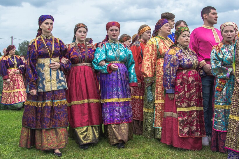 Когда наступает праздник, жители наряжаются и надевают специальные красочные костюмы. Но это не просто переодевание, а важный элемент традиции. Наряды подбираются тщательно, ведь они отражают личность человека, являются его гордостью. При выборе, безусловно, учитывается материал, из которого сделан наряд, и цвет, а в зависимости от статуса и возраста человека добавляются различные нашивки и украшения. У девушек наряд состоит, как правило, из рубахи, сарафана, шелкового фартука, парчи и головного убора — налобных повязок или платка. У мужчин костюм несколько проще — рубаха, штаны и узорные чулки.