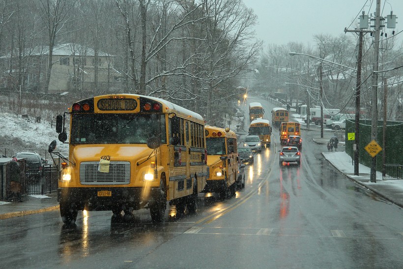 Школьные автобусы развозят хасидских детей по домам после школы. Детей много, поэтому автобусы идут караванами.
