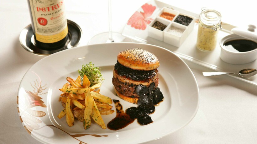 Вкус трюфеля можно почувствовать не только в основе, но и в соусе, и в самой булочке. Шедевр подается с гарниром и бокалом хорошего вина.