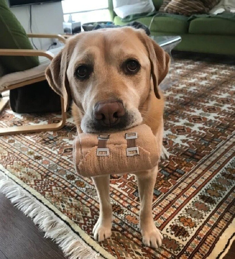 Пёс заботливо принес хозяину бинт, пока тот разминал больную лодыжку