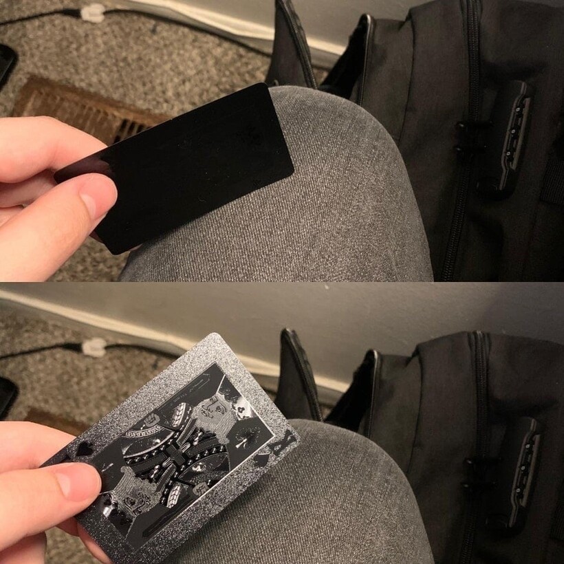Если смотреть на эти карты сбоку, под углом, то они будут выглядеть как просто черное пятно. Изображение можно увидеть лишь глядя прямо на них. Удобно! Никто из других участников игры не сможет схитрить, подглядев карты соперника.