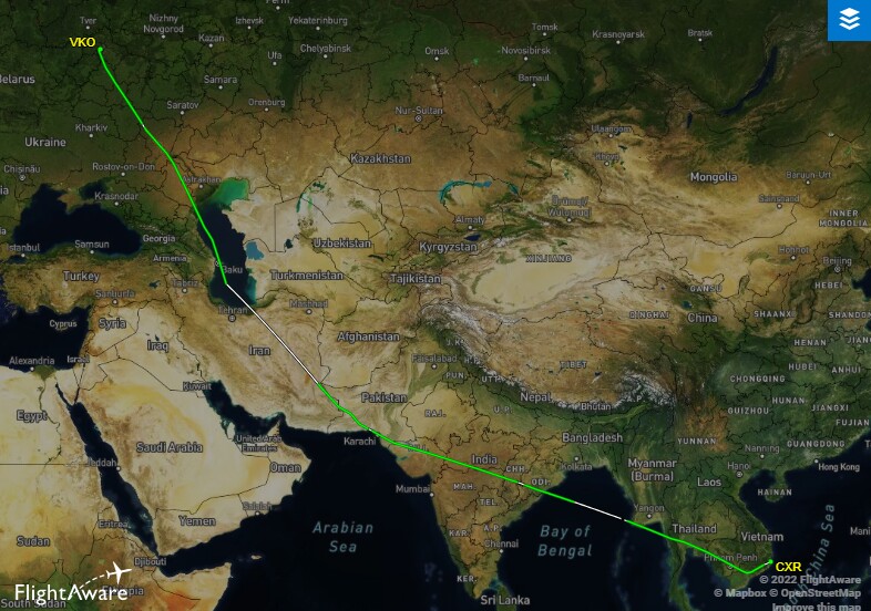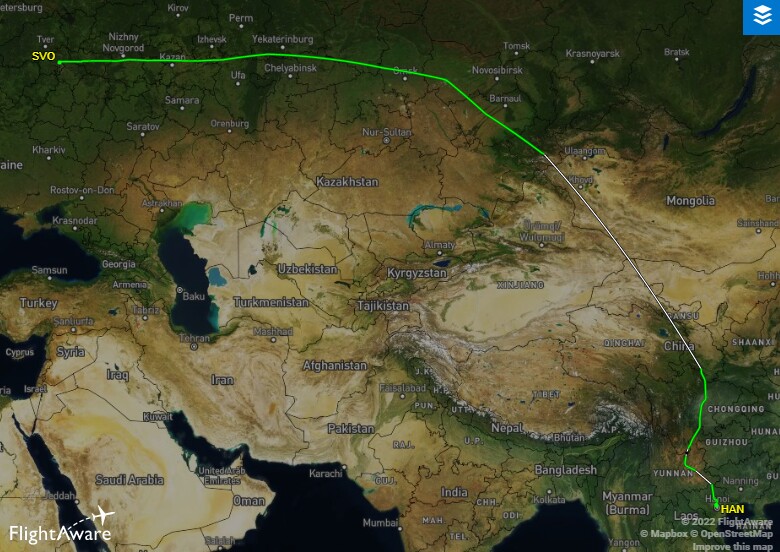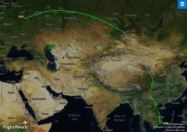 Сейчас же самолеты в Нячанг следуют через Монголию. На продолжительности полета это почти никак не отразилось: он длится 10 часов 40 минут. Остальные рейсы в другие города (Ханой и Хошимин) по-прежнему совершаются из Шереметьево, через воздушное пространство Монголии и Китая.