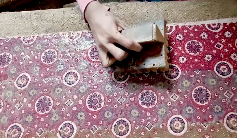 Второй этап не самый приятный, но крайне необходимый: ткани опускают в жидкий верблюжий навоз, смешанный с содой и красителями. После такой обработки ткань делается особенной, и в будущем это позволит сделать узоры на ней яркими и глубокими. После ткань сушат на солнце, и можно начинать третий этап — штамповку. В этом кроется главная особенность пакистанских шалей — на каждую нанесен рисунок в виде небольших узорчатых блоков, словно кто-то скопировал плитку или мозаику на ткань. Всего существует 4 традиционных узора, но мастера могут сделать разные блоки, чтобы разнообразить свой ассортимент. К слову о плитке, вы уже видели как египтяне делают ее по старинному рецепту, которому много сотен лет?