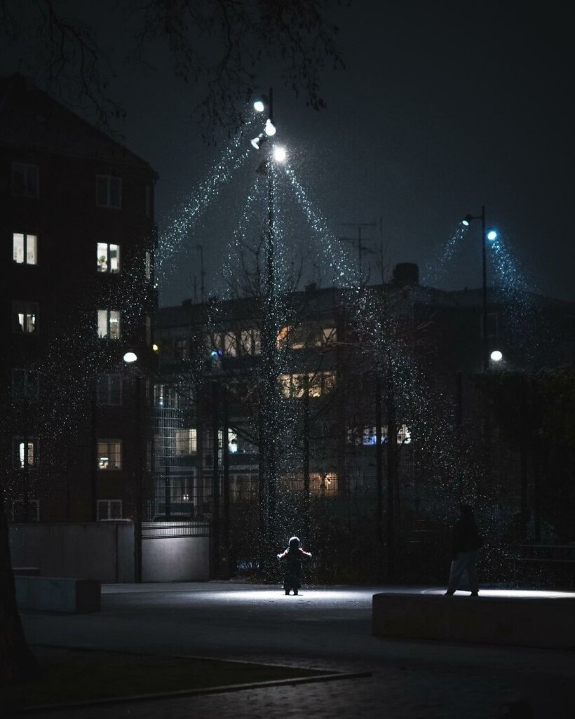 По дороге в магазин мужчина заметил струящийся свет от уличных фонарей, в котором кружились падающие с неба снежинки. Он решил остановить машину и сфотографировать это волшебство на свой телефон. Жена и ребенок приняли участие в съемке. И вот что у них получилось.