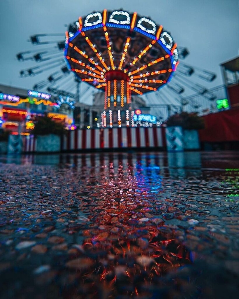 Отражающийся от ярких огней карусели свет на мокрых от дождя камнях