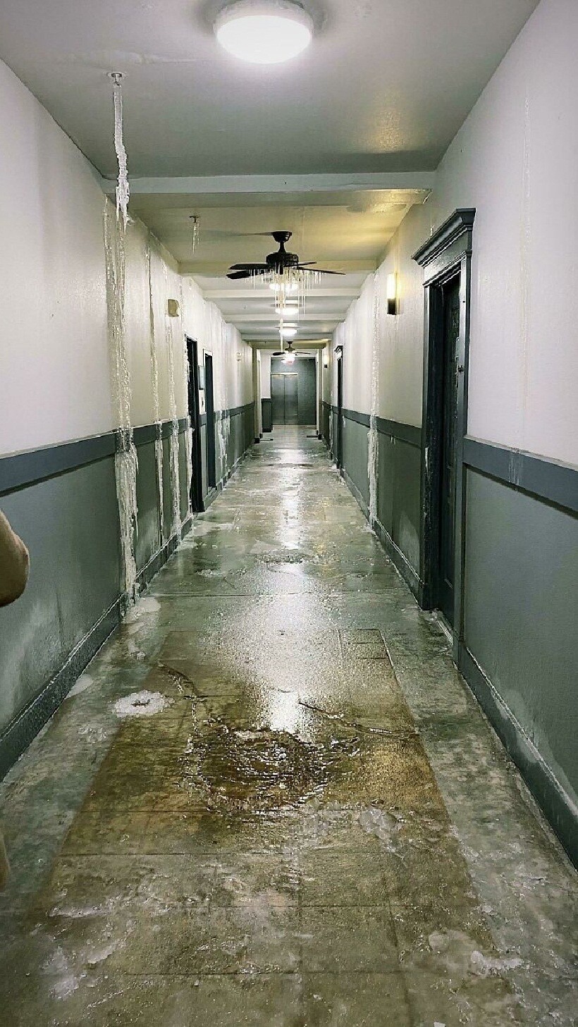 Даже просто глядя на этот замерзший коридор между квартирами, чувствуешь мороз по коже.