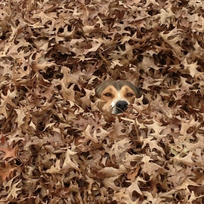 Многие собаки любят прыгать в кучи листьев, чем и занимается пес на фото.