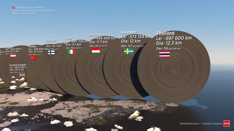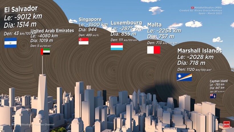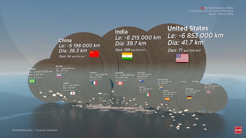 Многие из более коротких дорожных сетей находятся в островных государствах. И многие из них соответствуют довольно крупным странам. В видео также включены такие параметры, как плотность и длина дорожной системы по сравнению с площадью каждой страны.