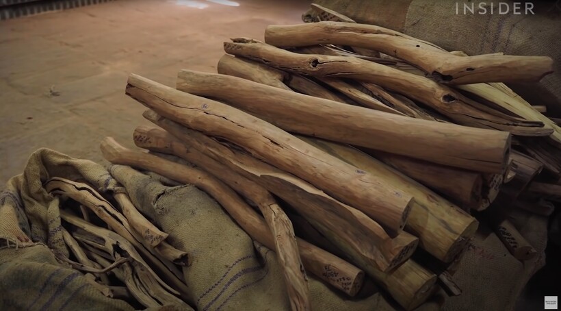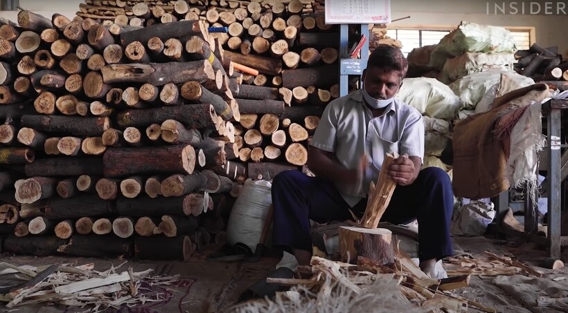 Последний фактор — это труд. Добыча сандалового масла — не простая задача и требует много усилий. Для начала требуется расщепить дерево, отделив темную внутреннюю часть ствола, ведь в сердцевине скапливается больше всего масла. Затем древесину перемалывают в два этапа: сначала на щепки, потом в порошок. Она проходит обработку дистиллятором, где в больших баках при помощи пара отделяется масло, а использованный порошок становится темным. Он станет основой для ароматических палочек и смесей, чтобы ни одна крупица сандала не потратилась зря. Масло же очищают до тех пор, пока его запах не станет ярким и насыщенным — идеальным для стойкого парфюма с древесными нотками.