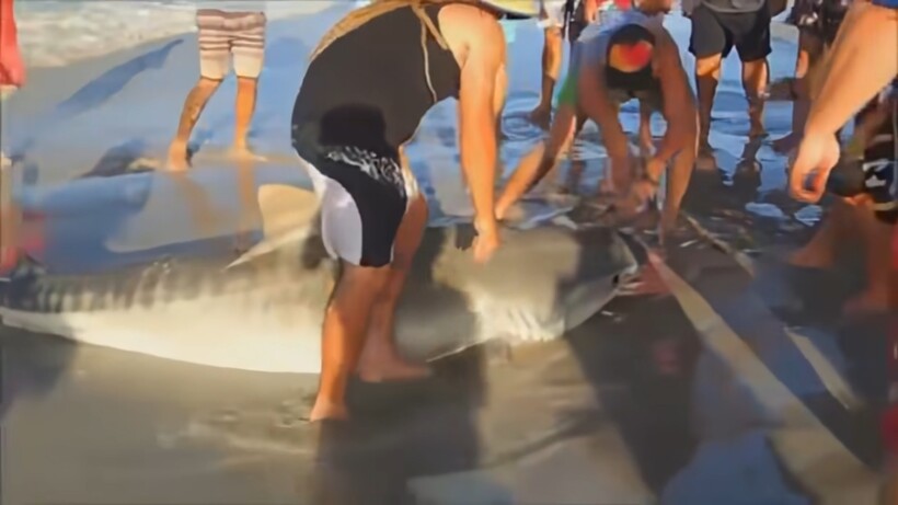 Эту двухметровую тигровую акулу с крючком во рту выбросило на берег. Люди, которые были в этот момент на пляже, решили помочь раненому животному. Один человек сел сверху на акулу, чтобы она не попыталась перевернуться и еще больше навредить себе, а другой стал плоскогубцами вынимать крючок изо рта животного. Наконец после нескольких попыток крючок был полностью удален. Однако возникла другая проблема: акулу нужно было отправить снова в воду. Сначала мужчина на видео попытался повернуть акулу к течению, чтобы волны подхватили ее, но у него ничего не получилось.