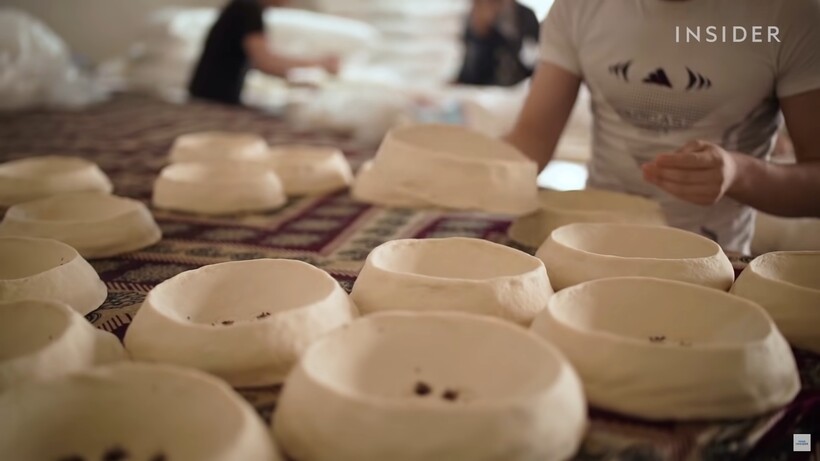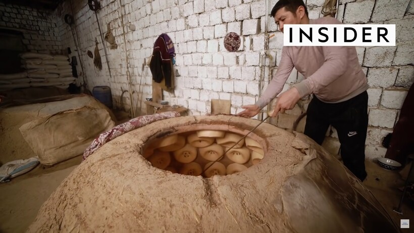 После наступает черед тындыров — больших глиняных печей. Они заранее протапливаются, сильно нагревая стены, а после того как дрова прогорели, пекари поливают тындыр водой, чтобы убрать лишний жар и не дать будущим хлебам сгореть. Многие задаются вопросом: как лепешки удерживаются на стенках тындыра и не падают, но ответ прост. Пекари смачивают дно лепешки водой, и она становится тем самым связующим звеном между сырым хлебом и печью. Одновременно в печь помещаются 56 больших булок по 1,5 кг или 72 маленьких по 1 кг. Важно рассчитать все до сантиметра, чтобы в печи не было пустой поверхности. Уже через несколько минут, когда центр стал хрустящим, а бока поднялись и зарумянились, хлеба можно вынимать.