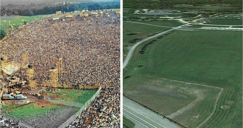 Слева фото сделано в августе 1969 года. Тогда известнейший рок-фестиваль собрал около полумиллиона человека. Справа — то же самое место в Нью-Йорке, но прошлым летом.