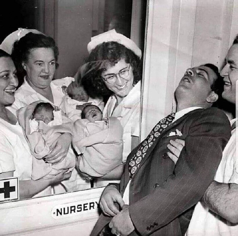 Медсестры родильного дома показывают мужчине его новорожденных тройняшек — новоиспеченный отец в шоке