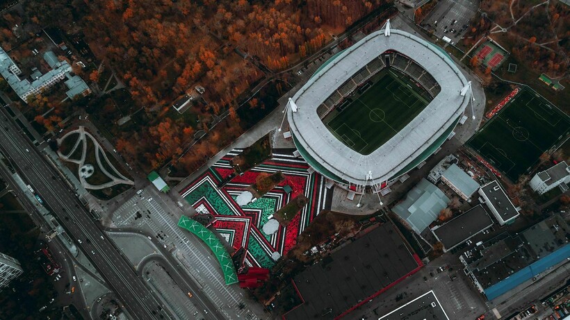Эта завораживающая работа русского художника — одна из самых масштабных. Посмотрите сами — изображение очень большое, сложно представить, скольких сил стоило украсить подъезд к арене!