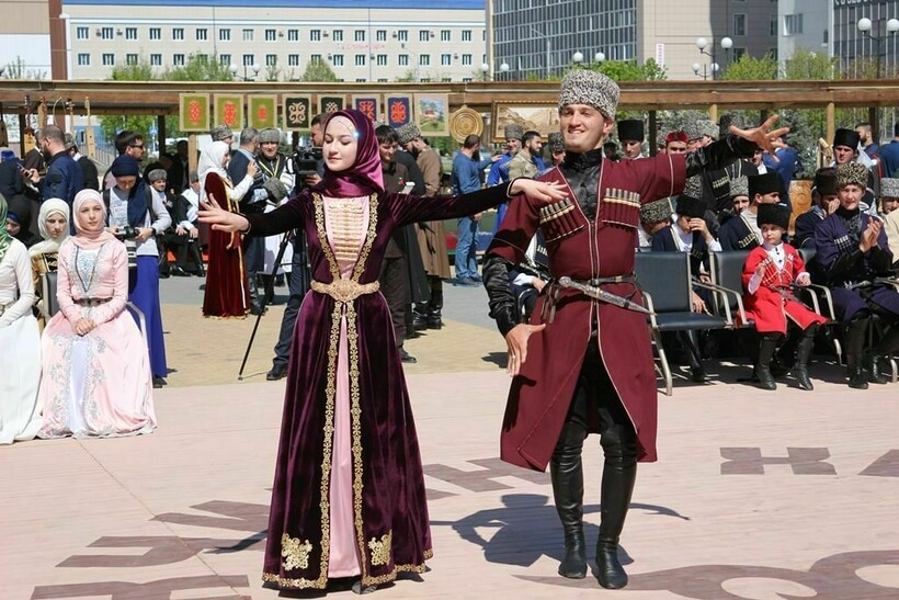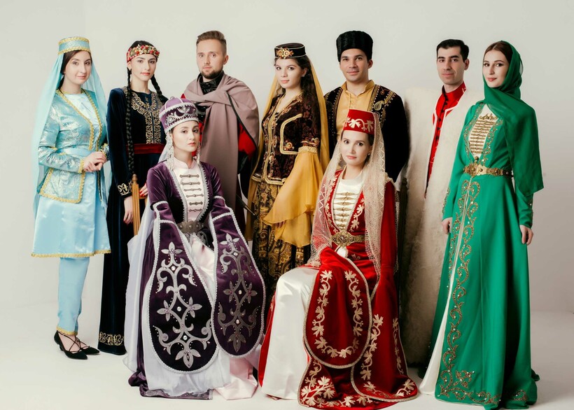 Мужской костюм состоит из рубахи, расшитых штанов и головного убора. Также обязательно надевается бешмет — вид верхней одежды. Женщины одеваются в нательную рубаху, а поверх нее — бархатное платье, как правило, красного, белого или черного цвета. Голова должна быть покрыта платком. Мы писали материал о том, как на Кавказе сочетаются традиции Европы и Азии — вы можете прочитать об этом здесь.