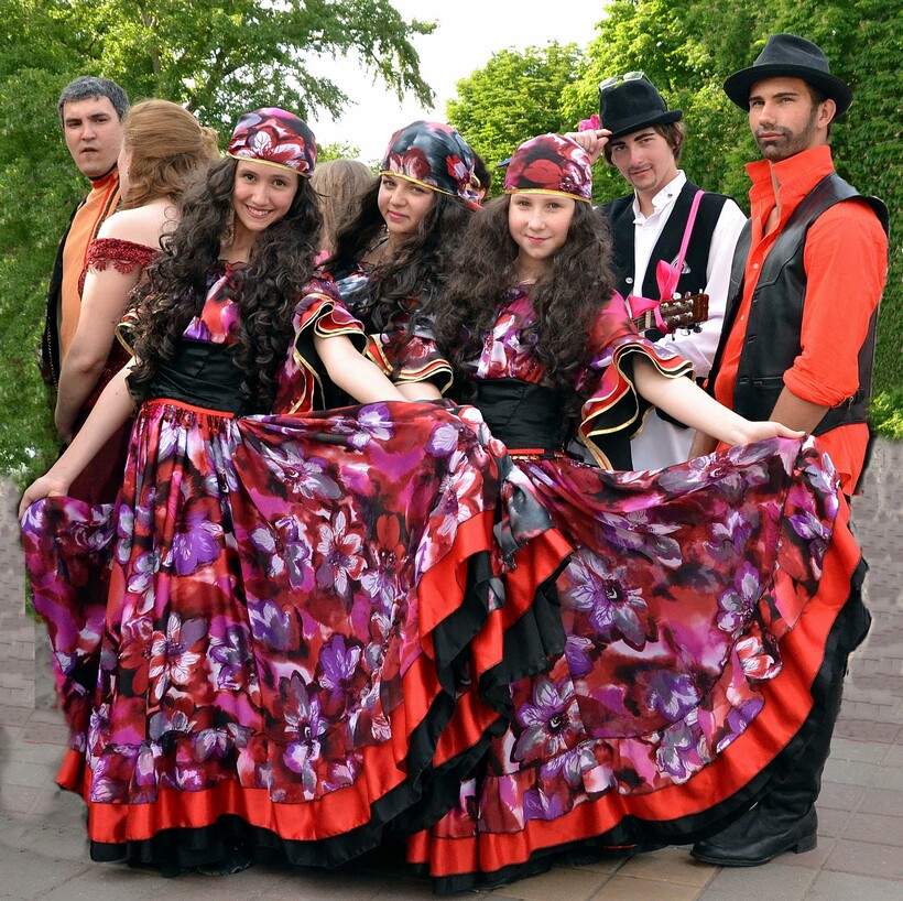 По цыганским поверьям, на человеке должно быть максимальное количество украшений и ярких цветов — это показывает достаток семьи, поэтому национальные костюмы, как правило, очень яркие и роскошные. Женский костюм состоит из широкой юбки солнцем, чтобы национальные танцы смотрелись еще эффектнее, а также кофты. Руки должны быть закрыты, но в некоторых вариациях может быть открыт живот. Мужчины одеваются в рубаху и штаны, тоже ярких цветов, и на одежде присутствует вышивка. Полноценной частью костюма является музыкальный инструмент, под который исполняются танцы.