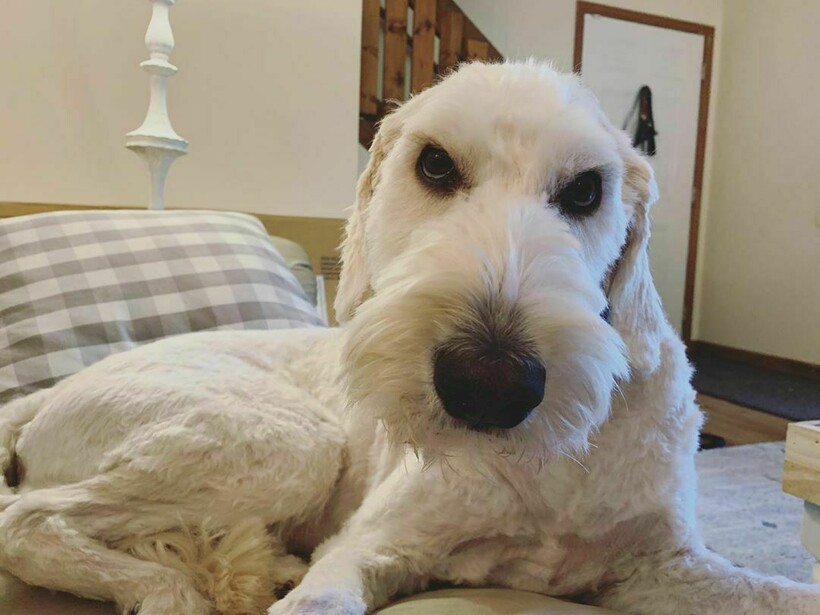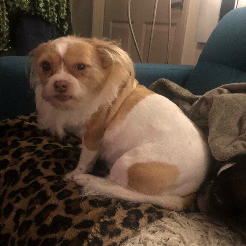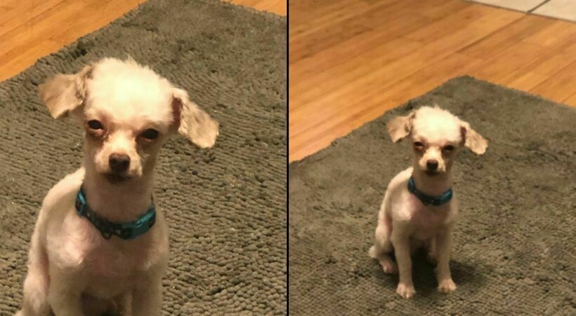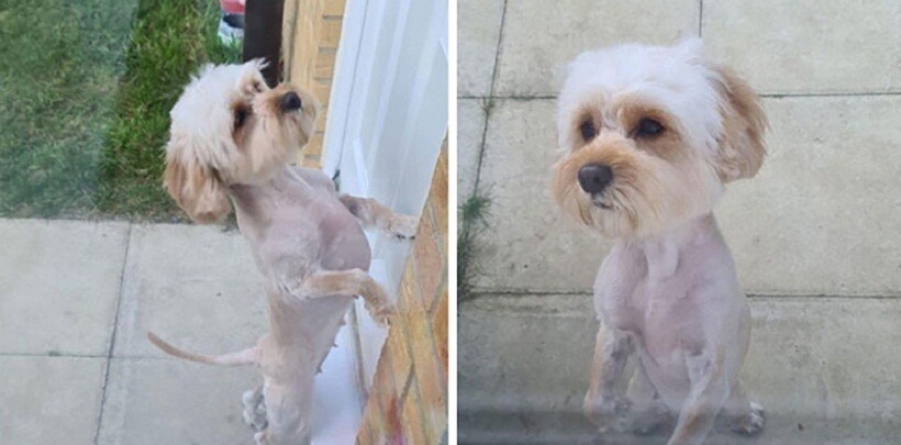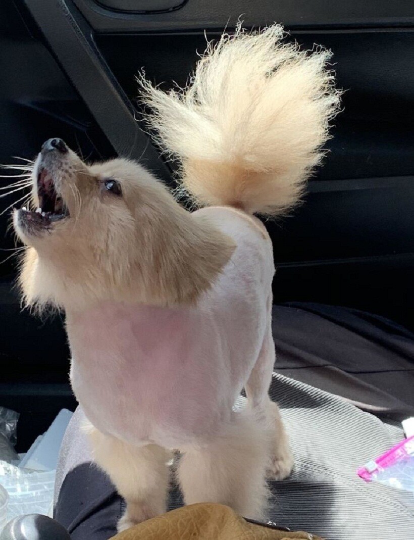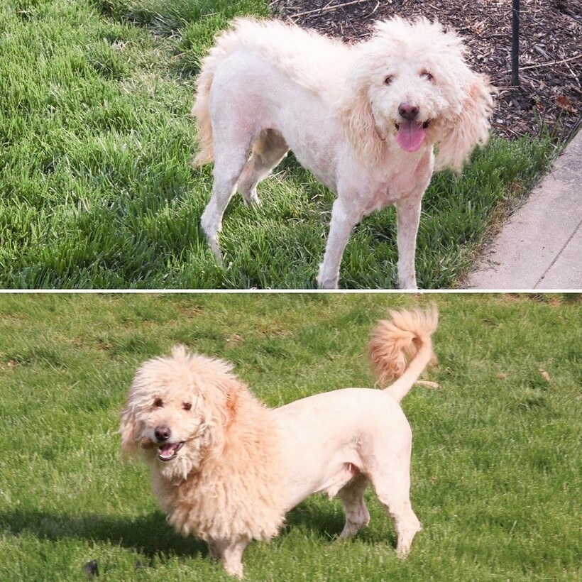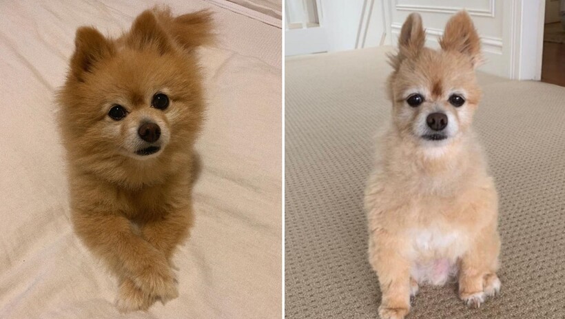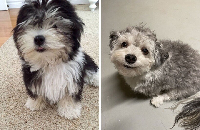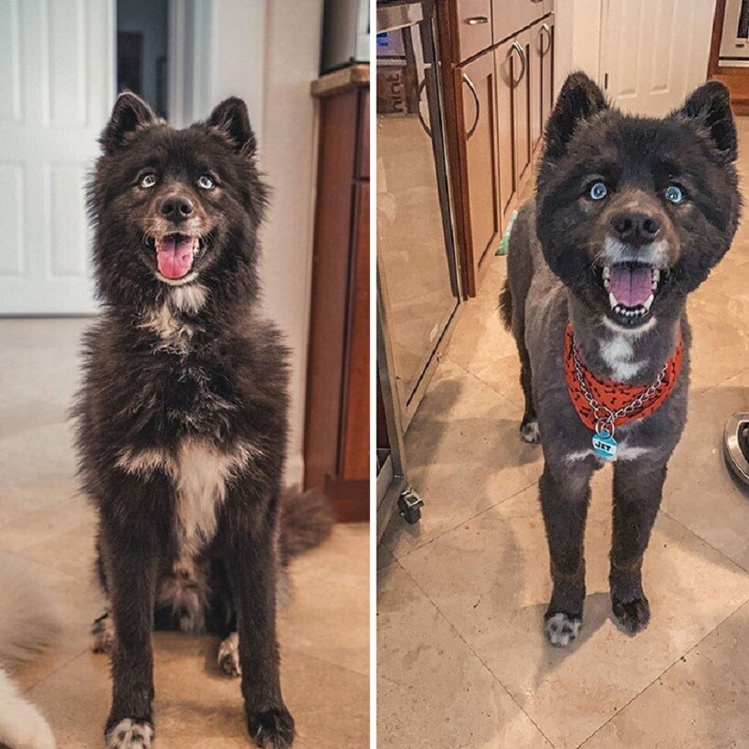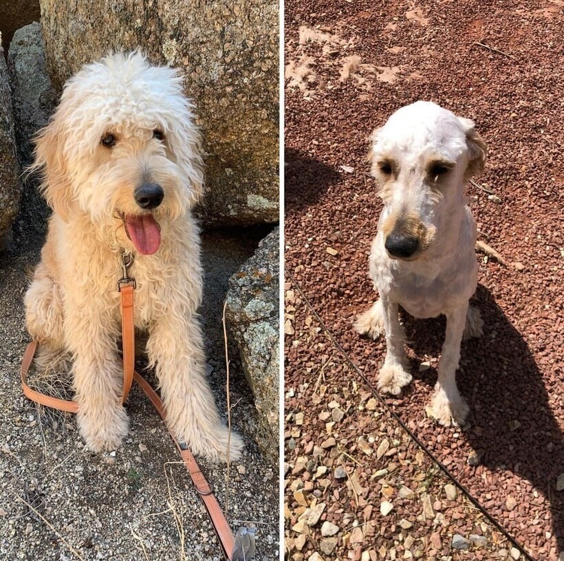 Счастливый щенок до стрижки и со взглядом полным разочарования после