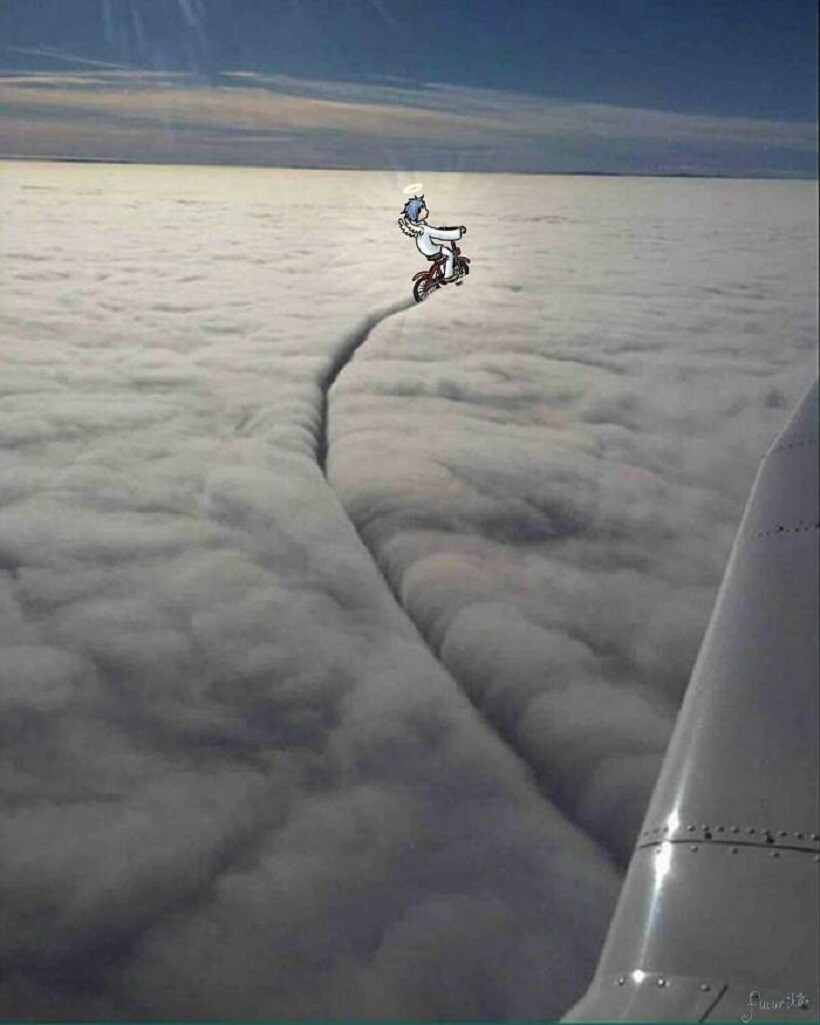 С этим милым велосипедистом скучный вид из самолета на затянутое облаками небо преобразился
