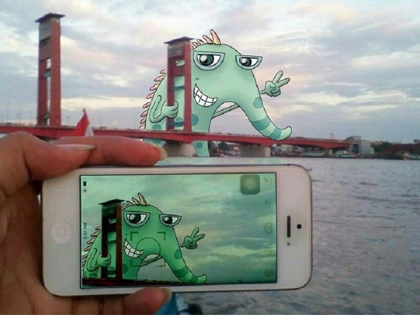 Гигантский динозавр с хоботом, как у слона, позирует с мостом