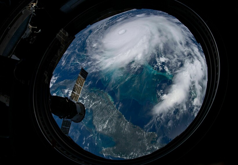 Чаще всего спутники снимают огромные ураганы, чтобы определить, насколько они разрушительны. Яркий кадр Дориана был сделан с борта МКС в 2019 году. Этот тайфун бушевал над Багамскими островами.