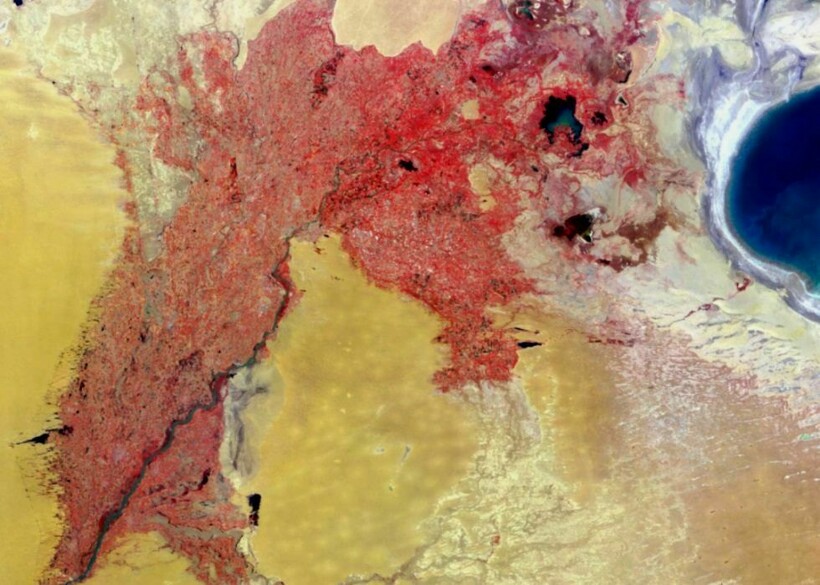 Снимок запада Узбекистана и северо-востока Туркменистана был сделан при помощи MISR, многоугольного спектрорадиометра, который есть на спутнике Terra. Он позволяет выделять темно-синим цветом всю воду: моря, реки и озера.