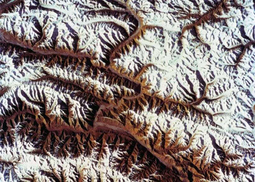 Это одни из самых высоких гор на планете, которые являются границами для нескольких стран. Через весь хребет проходит извилистая асфальтированная трасса, которая признана самой высокой в мире. Кадр 1993 года, сделанный с корабля Discovery Orbiter 103, показывает, насколько огромны эти горы и насколько причудливым кажется их узор с высоты.