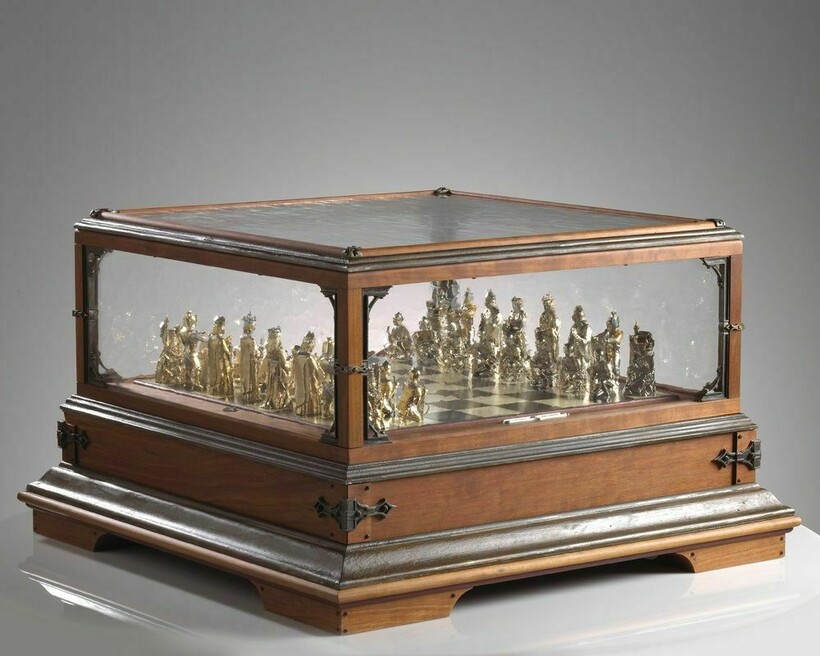 Этот набор можно назвать одним из самых тяжелых в мире — помимо фигур, здесь, конечно, еще есть доска, и они находятся под специальным стеклянным «куполом», который оберегает их. Всего таких наборов было изготовлено чуть больше десятка, поэтому каждый набор является большой редкостью, его вполне можно выставлять в музеях, но их приобретали частные лица, которые сделали их частью личных коллекций. Фигуры изготовлены из драгоценных металлов и имитируют реальных людей: королей, королев, рыцарей и епископов. Доска сделана из редкого черного дерева со вставками вишневого. И, конечно, здесь присутствует серебро.