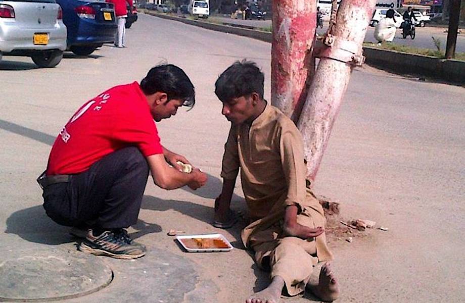 Пакистанский официант кормит бездомного, который не может двигать руками.