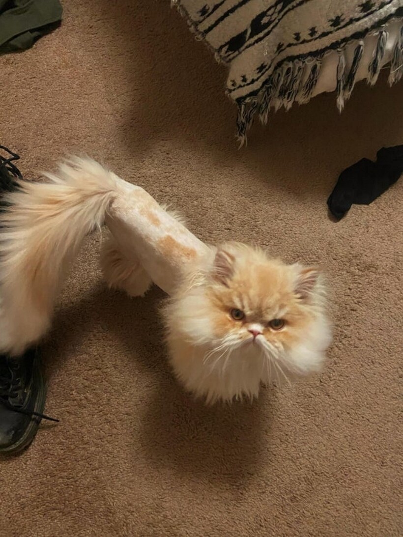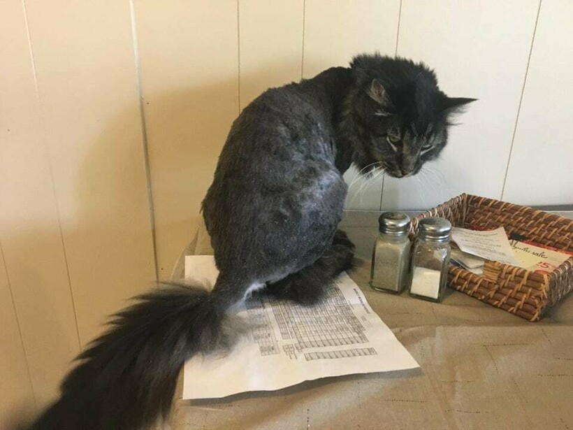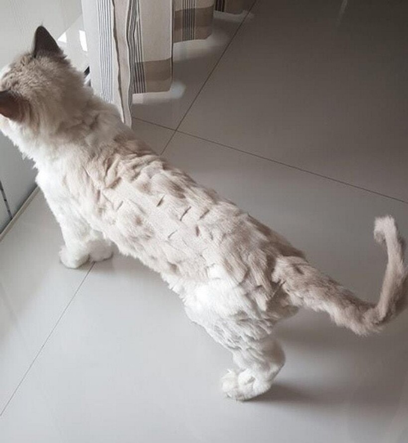 Женщина ещё даже не имеет навыков парикмахерского искусства, а уже смогла придумать новую стрижку и преобразить котика до неузнаваемости.