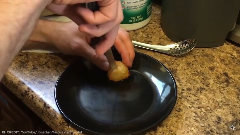 Пончики, гамбургеры, зефир и овощи — все это встречалось во фритюре в США, но теперь один шеф-повар нашел способ жарить воду. В ролике показано, как Джонатан Маркус опускает каплю воды в муку и панировочные сухари и помещает ее во фритюрницу, нагретую до 190⁰ по Цельсию. Однако эксперимент не так однозначен, как кажется. Он добавил в свой рецепт альгинат кальция — желеобразное вещество, позволяющее предмету сохранить изначальную форму. Добавленный ингредиент предотвратил превращение воды и муки в мутное месиво.