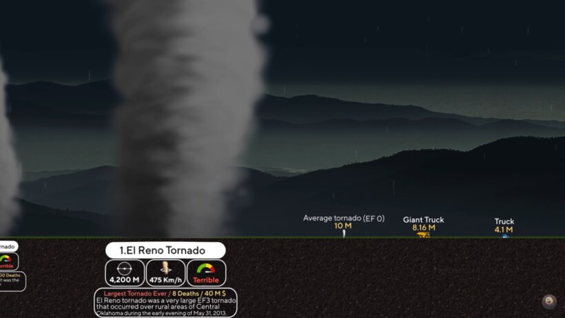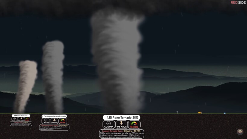 Первое место в топе самых разрушительных торнадо занимает торнадо в Эль-Рино, который обрушился на штат Оклахома в 2013 году. Его диаметр достигал 4 с половиной километров. Только представьте, что на вас движется воронка диаметром более, чем в 4 километра! Кстати, скорость ветра в ней достигала 475 километров в час! Только от одной картинки этого монстра становится не по себе. Чтобы вызвать еще большую панику, автор ролика решил изобразить гигантский грузовик, который кажется крохотной машинкой на фоне огромной вращающейся воронки. А вы когда-нибудь видели смерч своими глазами?