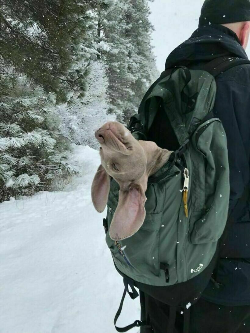 Главное, чтобы рюкзак был вместительный и пустой. Кажется, этот пес абсолютно счастлив от такой прогулки.
