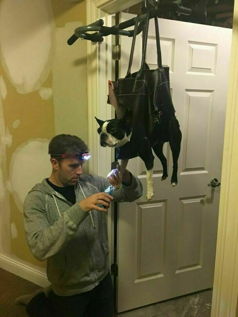 Чтобы хвостатый не вырывался во время этой процедуры, хозяин придумал такое хитрое приспособление. Псу ничего не оставалось, как смириться.