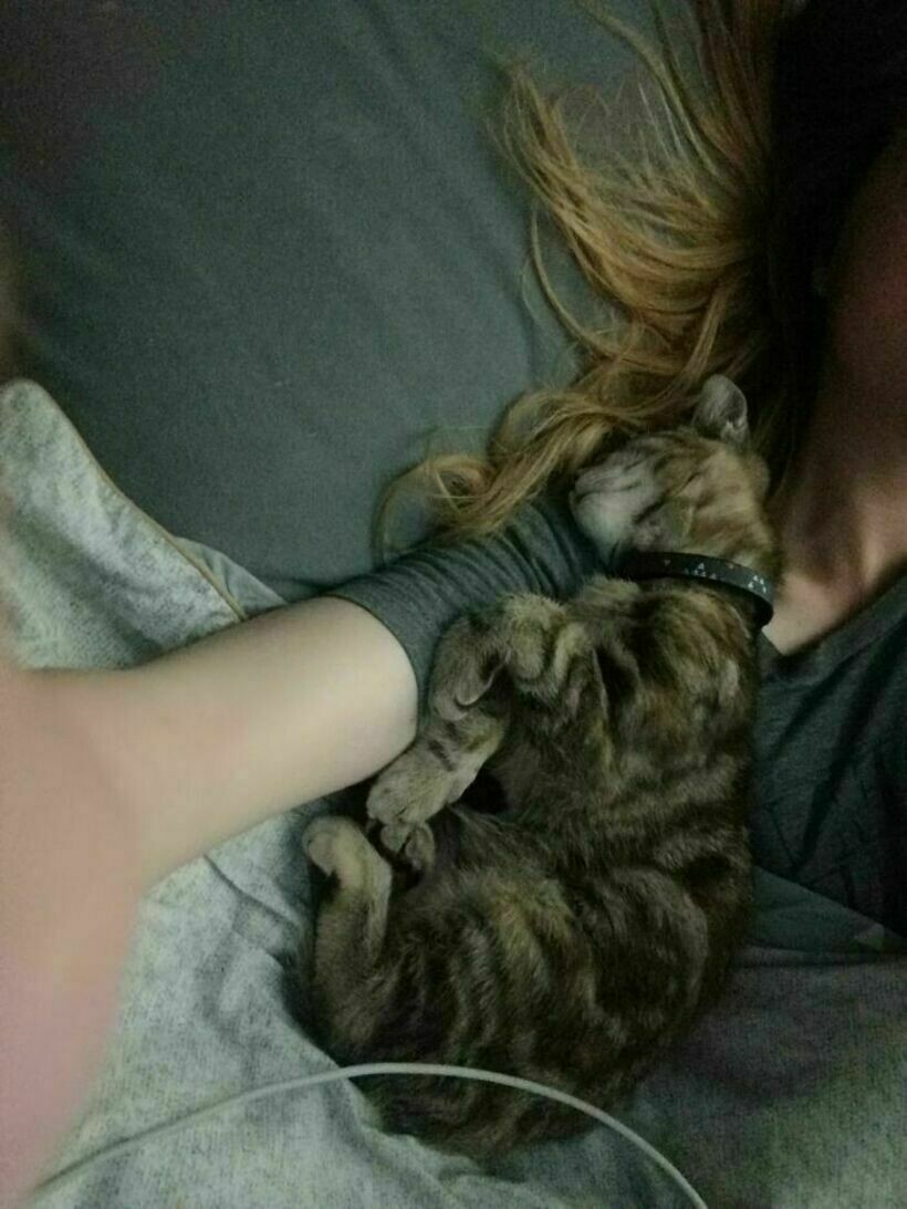 Котик уснул на плече у хозяйки