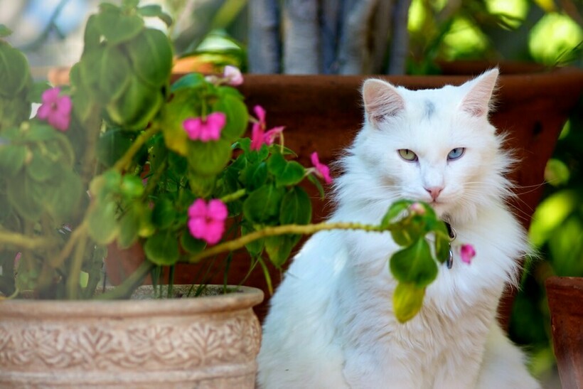 Грациозная кошка с разными глазами отличается общительностью, хотя никогда не требует внимания хозяина, а лишь отвечает взаимностью.
