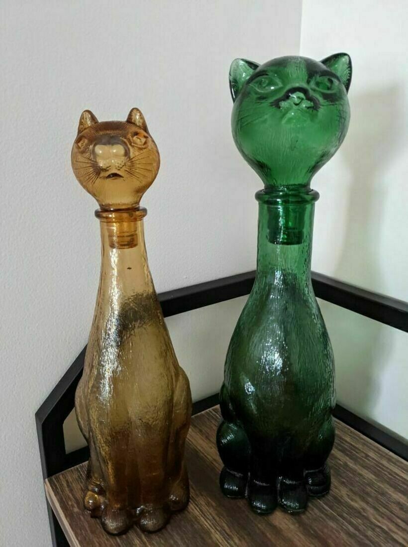 Графины в виде котов, выполненные из янтарного и зеленого стекла
