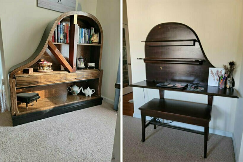 Мужчина, который приобрел инструмент, дал ему новую жизнь, превратив его в книжные полки и письменный столик.
