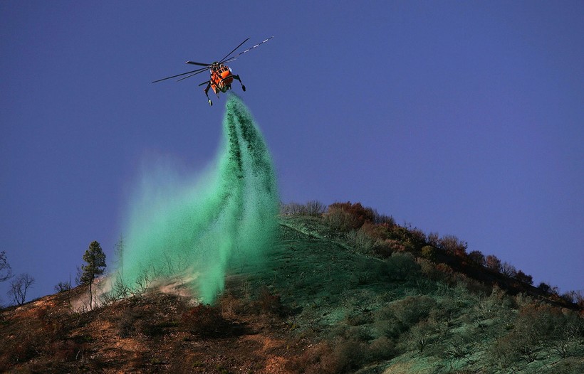 Это зеленой вещество, которое вертолет распыляет на выгоревший от пожара склон, является древесной мульчей. Она создает противоэрозийный слой, который улучшает прорастание травы