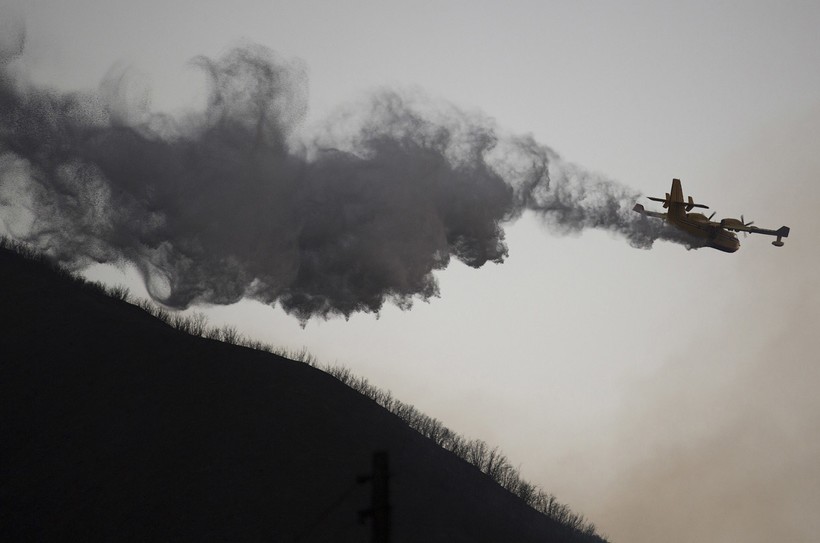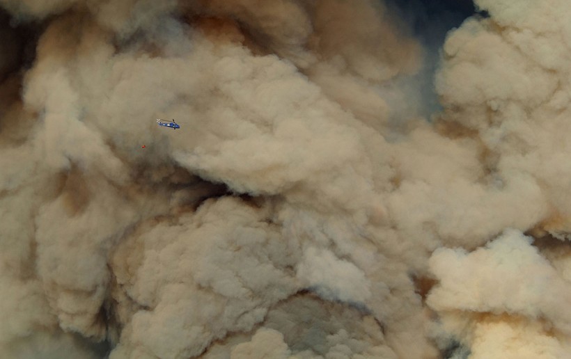 Пожарный вертолет кажется совсем крошечным — сразу становятся понятны масштабы пожара