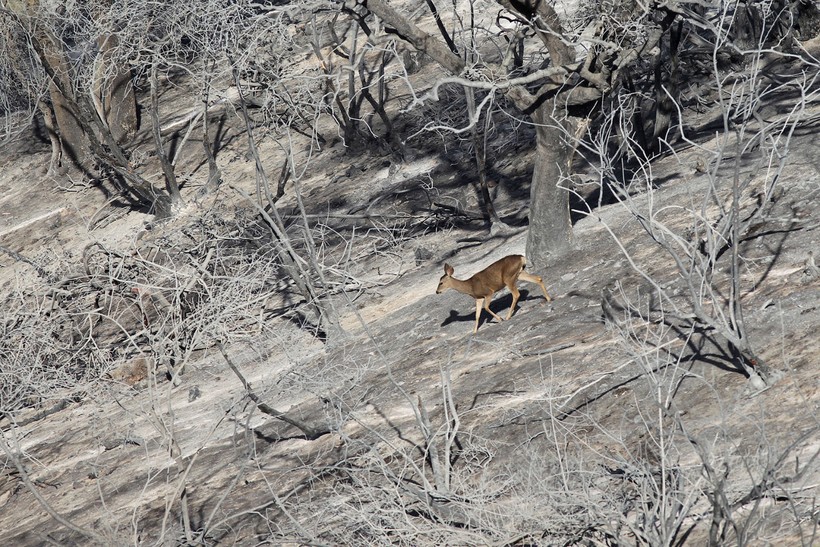 Выживший олень бежит по серому сгоревшему лесу в Калифорнии