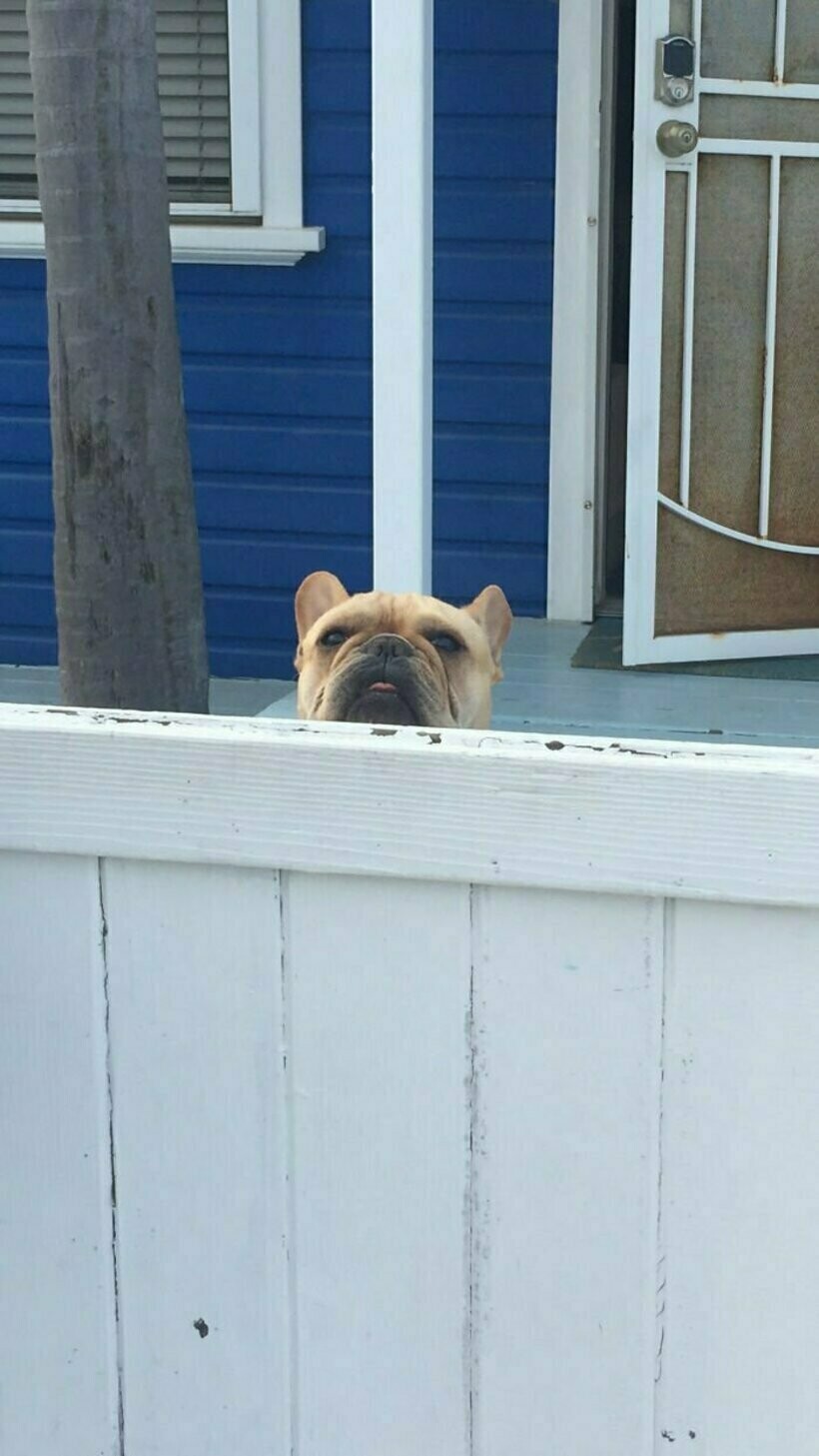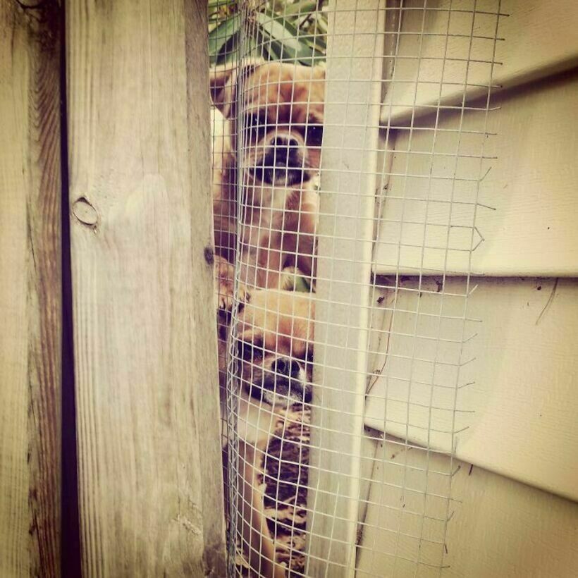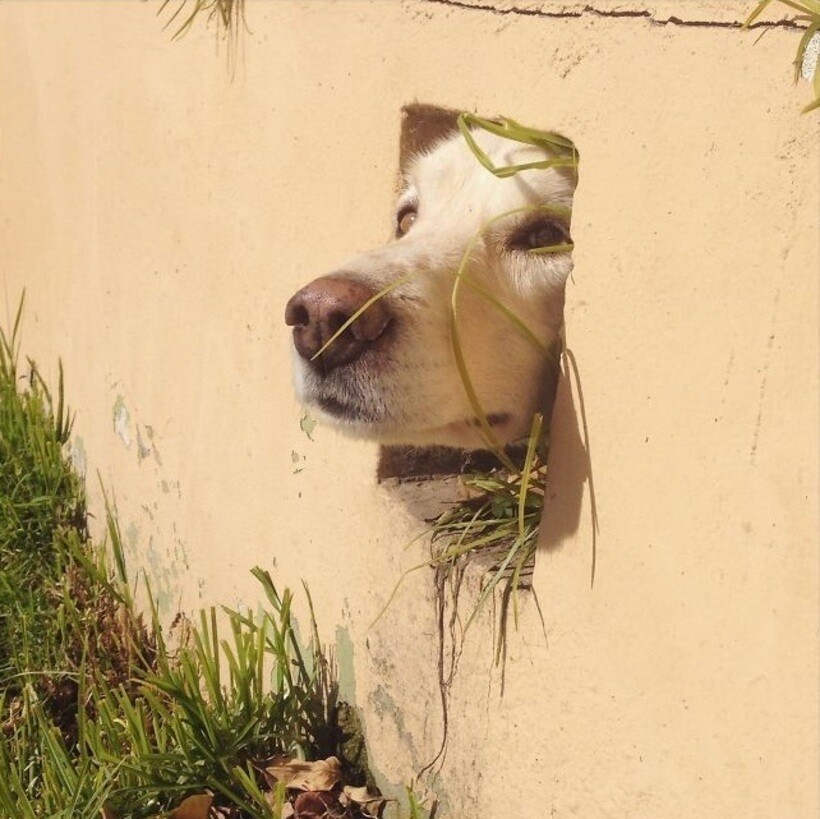 Через забор-решетку и так все хорошо видно, но ему нравится наблюдать за прохожими вот так