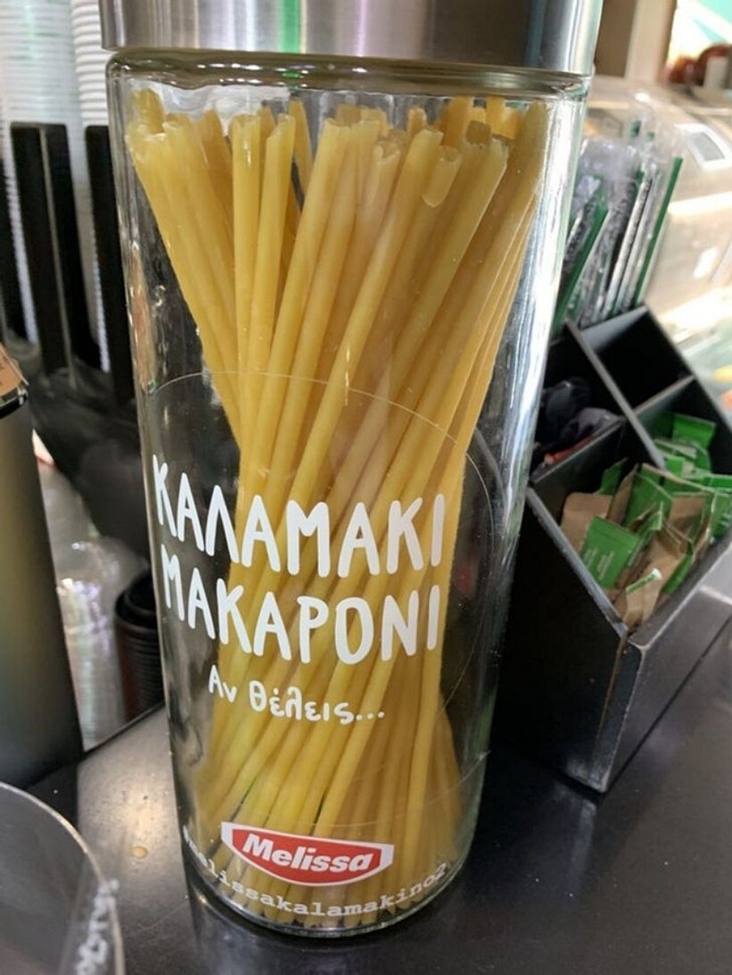 Во многих местных кафе вместо пластиковых трубочек для коктейлей можно воспользоваться настоящими макаронами. Это фото, например, сделано в городке Каламики.