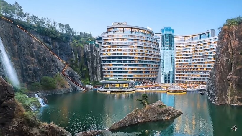 В Китае есть множество удивительных мегапроектов, и этот не стал исключением. В 2018 году был открыт отель, расположенный в заполненном водой заброшенном карьере глубиной 88 метров. Отель на 336 номеров состоит всего из двух уровней над землей, а еще 16 погружаются в карьер. Получившийся в результате комплекс включает в себя такие удобства, как подводный ресторан и аквариум, и все это выполнено в форме, которая стремится свести к минимуму его воздействие на местную окружающую среду. Что интересно, во время строительства здания инженеры запатентовали 41 процесс производства, но эти трудности того стоили.