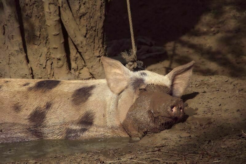 Сладко спящая свинка, которой очень уютно в грязевой луже