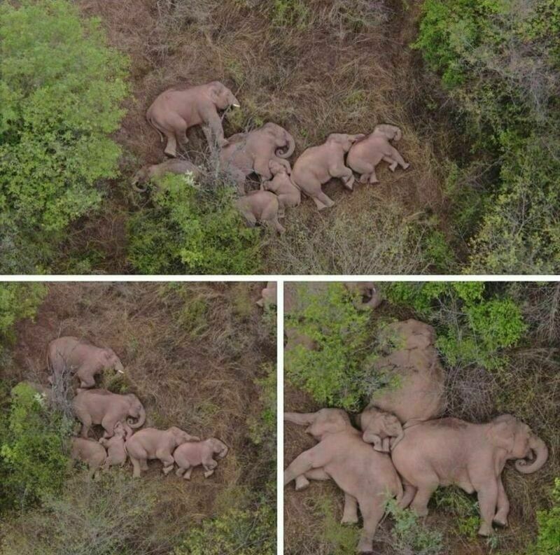 Слоны далеко не всегда спят стоя, они умеют спать и лежа. Стоя они спят лишь во время медленной фазы, а ложатся на период быстрого сна. Кстати, о слонах с последней фотографии мы рассказывали отдельно: они сбежали из заповедника, отправились в путешествие и прошли сотни километров.