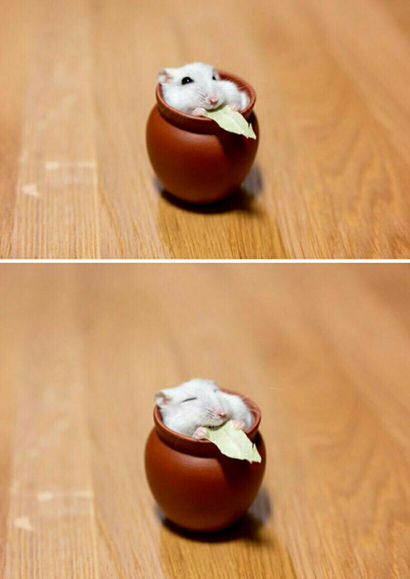 Просто хомяк, который наслаждается угощениями, сидя в маленьком глиняном горшочке