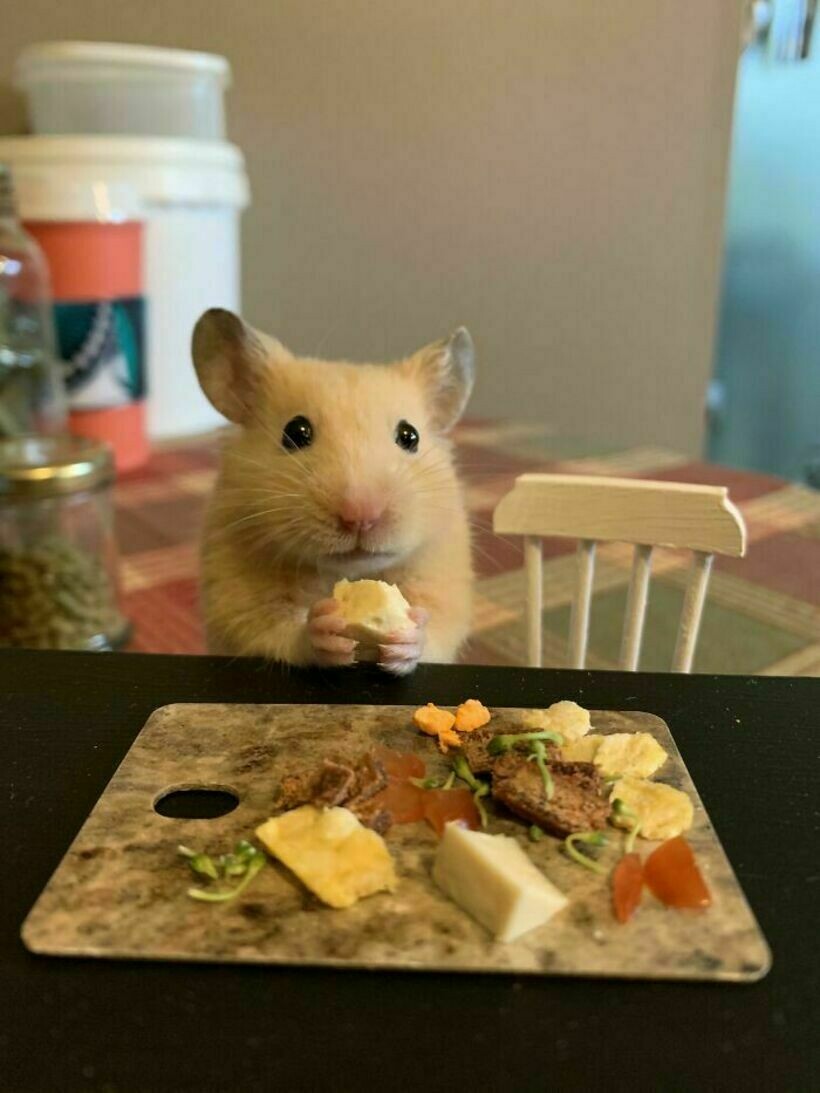 В подарок он получил милый праздничный колпачок, любимый овощ и новые игрушки в клетку, которые позволят ему почувствовать себя альпинистом.