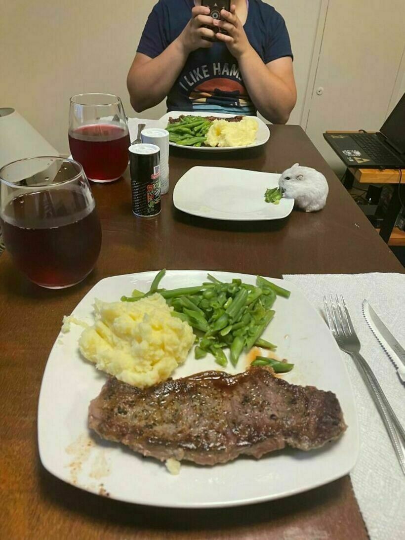 Хомяку выделили свою отдельную тарелку и дали немного зеленой фасоли.
