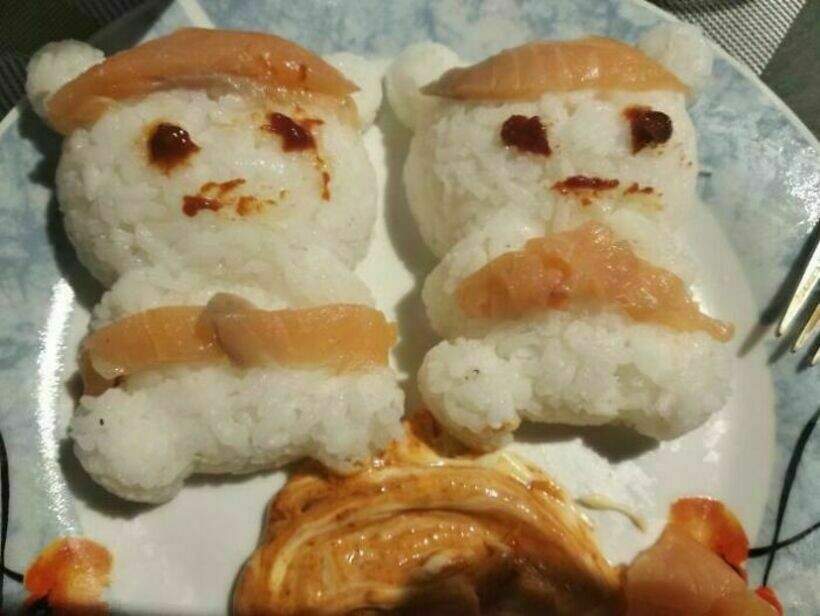Например, эти рисовые панды-сумоисты не что иное, как суши с лососем.