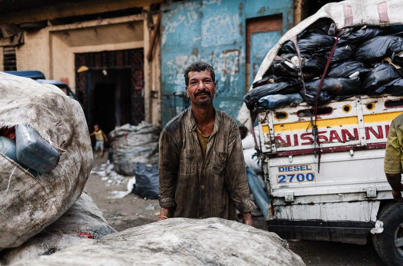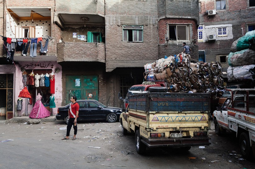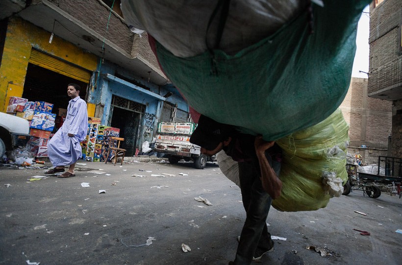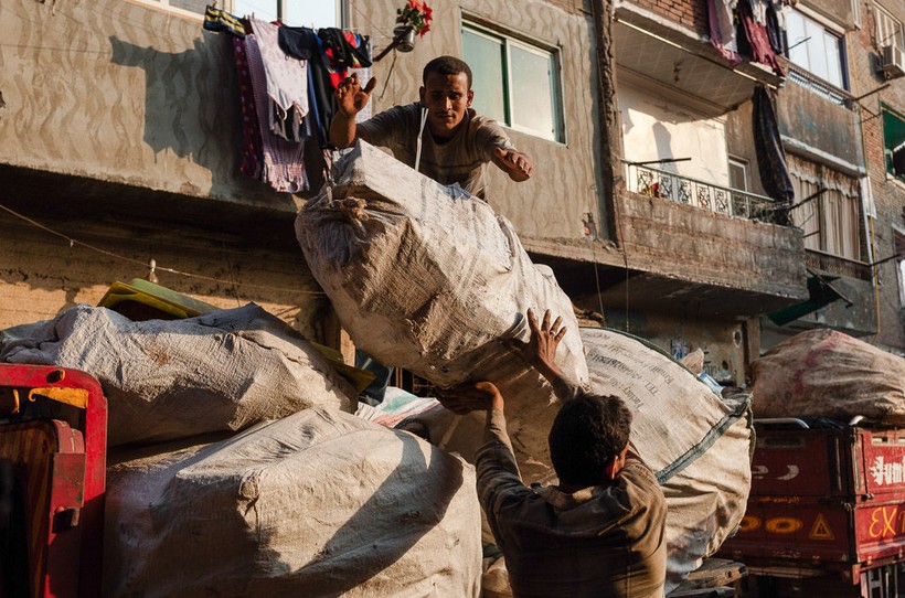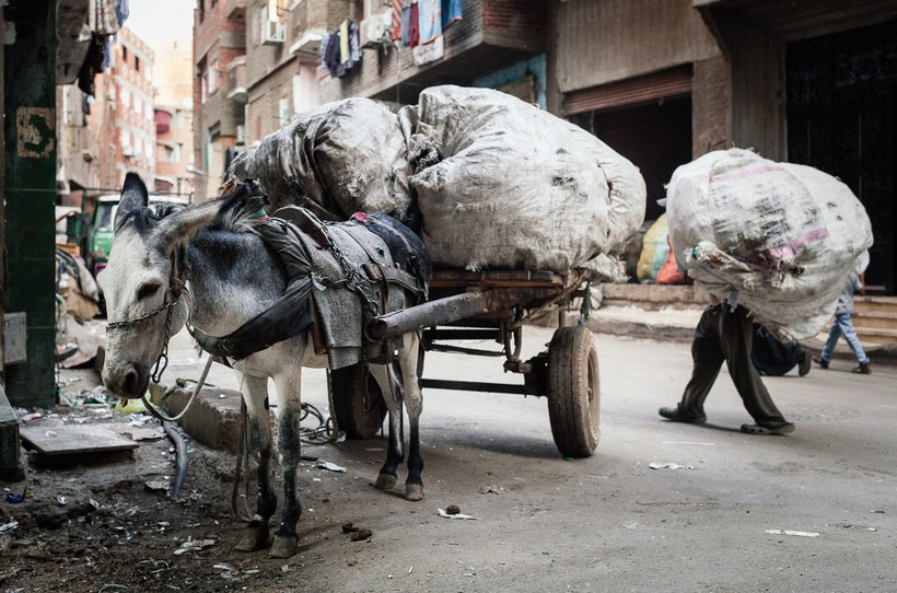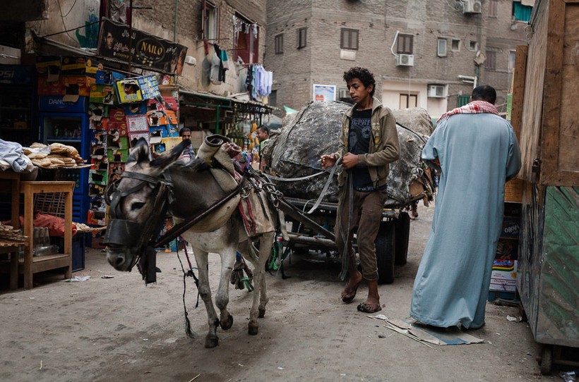 Копты размещаются по всему Каиру со своими повозками, запряженными ослами. На этих повозка они транспортируют мешки с мусором к ближайшим пикапам, которые уже доставляют груз в Город мусорщиков.
